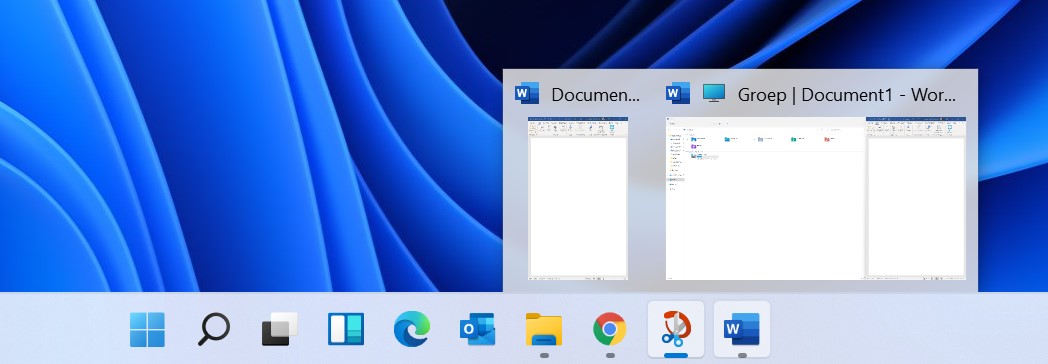 Microsoft heeft dat probleem nu opgelost, met Snap Groups. Daarmee onthoudt Windows 11 hoe je je vensters had geordend in een Snap. Stel je klikt dan op het Word-icoon in de taakbalk, dan zie je alle open vensters van Word, plus nog een miniatuurweergave van je Snap Group. Als je daar dan op klikt, dan herstelt Windows 11 in een keer de vensters van je Snap. Dat is erg handig. Het is iets wat je vanzelf tijdens het gebruik van Windows 11 vast wel tegen komt als je Snaps gebruikt.